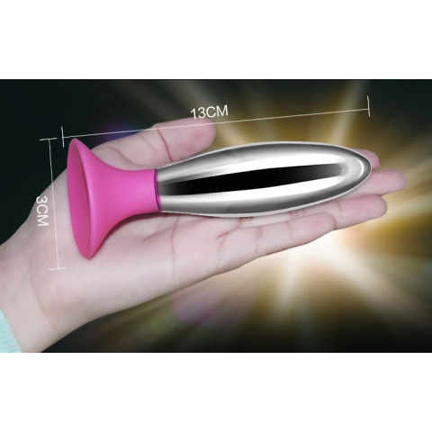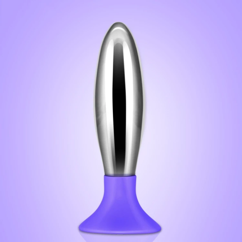 Корпус выполнен из гладкой нержавеющей стали, которая легко адаптируется к температуре — можно охладить или слегка подогреть изделие перед использованием. Верхняя часть украшена вставкой из силикона насыщенного фиолетового цвета. Пробка компактная, с плавной формой, что делает её удобной в использовании и лёгкой в уходе.