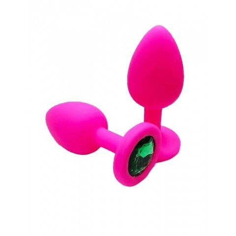 Анальная пробка из розового силикона с зелёным кристаллом, S