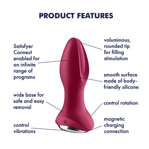 Девайс водонепроницаем, перезаряжаем и выполнен из гипоаллергенного бархатистого силикона в бордовом цвете. Ключевой его особенностью является имитация римминга, которая осуществляется благодаря сочетанию интенсивных вибраций и вращающихся жемчужных цепочек. Интенсивные программы вращения обеспечивают разнообразную стимуляцию, усилят ее 10 бесшумных режимов вибрации по-умолчанию, которые вы можете редактировать под свои предпочтения. За счет возможности синхронизации с мобильным приложением Satisfyer Connect APP вам откроются дополнительные функции, расширяющие горизонты наслаждения.