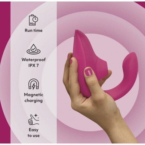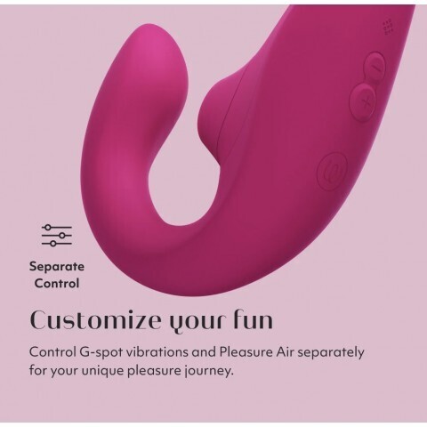 Двухзонный вибростимулятор с бесконтактной воздушной стимуляцией и отдельной виброголовкой для внутреннего воздействия. Технология Pleasure Air работает без прямого контакта: воздушные импульсы передаются через насадку на области внешней стимуляции. Изогнутая рабочая часть предназначена для фокусированного давления на переднюю стенку, при этом оба узла управляются раздельно. Компоновка позволяет включать их одновременно или по отдельности.