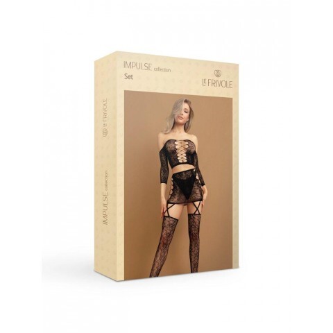 Состоит комбинация из сетчатых топа с юбкой и чулок, украшенных красивыми узорами. Имитация шнуровки спереди топа и по бокам юбки акцентируют внимание на самых желанных частях женского тела. Открытые плечики демонстрируют изящество ключиц и шеи, до которых вашему благоверному захочется скорее прикоснуться губами, что ускорит момент возбуждения и последующего сексуального трипа.