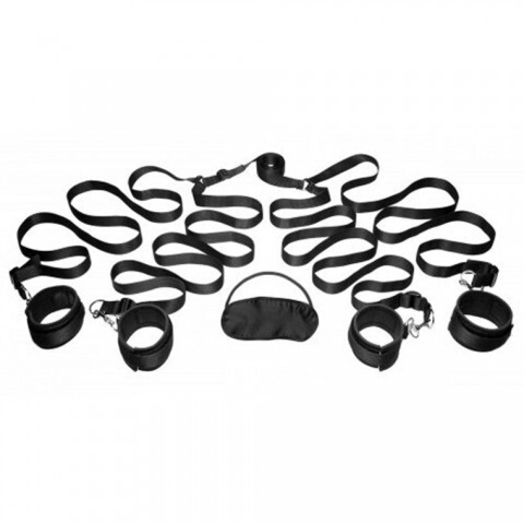 В комплект входят мягкие, но надёжные манжеты для рук и ног, длинные ремни, которые легко закрепляются под кроватью или матрасом, и элегантная маска для глаз, усиливающая остроту ощущений.