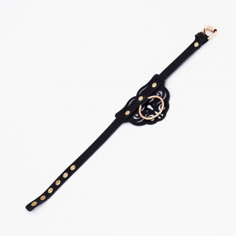 Чокер от Crazyhandmade из высококачественной натуральной кожи с декоративными резными узорами и металлическими клепками — это смелое сочетание стиля и элегантности. Глубокий черный цвет подчёркивает строгость и дерзость образа, а золотая фурнитура придаёт изделию роскошный, утончённый акцент.
