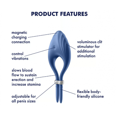 Девайс влагоустойчив, перезаряжаем и выполнен из супер мягкого гипоаллергенного силикона в синем цвете с ребристой структурой. Благодаря серебристым ползункам у вас есть возможность контролировать уровень сжатия. Он плотно обхватывает пенис, поддерживая стойкую эрекцию и повышая выносливость в процессе полового акта за счет удержания крови. Обладает функцией мощной, но бесшумной вибрации по всей его поверхности в количестве 12 режимов. Идеальный вариант для использования в паре, так как стимуляция будет затрагивать обоих партнеров.