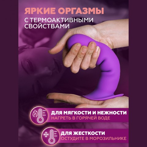 Выполнен дилдо из смеси гипоаллергенных силекспана и силикона в лиловом цвете. Главной его особенностью является термореактивность, за счёт чего под воздействием температуры он меняет плотность, позволяя вам испытать на себе удивительный опыт. Вы можете нагреть его в микроволновой печи или горячей воде до 30 секунд, получив более мягкую, гибкую и эластичную форму, придав стимуляциям нежности. В случае охлаждения же, он примет жёсткое положение, которое придётся по нраву любителям игр поострее. На основании имеется прочная присоска, предполагающая закрепление её на плоской поверхности для удовольствия без участия рук.
