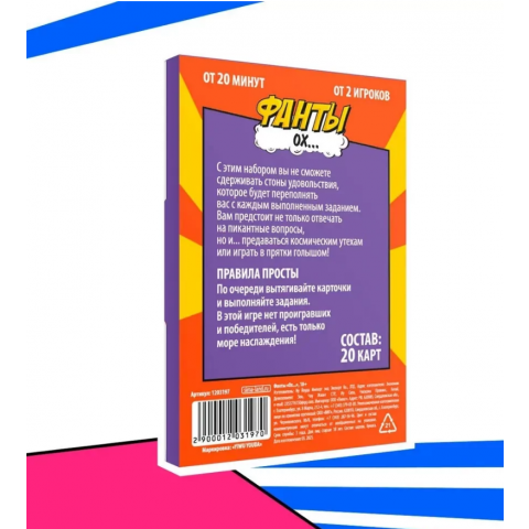 Фанты «Ох...», 20 карт, 18+ — откровенная игра для двоих, которая пробуждает страсть, развивает фантазию и превращает обычный вечер в чувственное приключение. Она создана для тех, кто хочет добавить в отношения больше азарта, флирта и взаимного влечения.