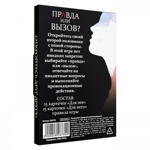 Представляем новинку карточную игру «Правда или вызов?» от Ecstas, которая поможет вам открыться своей половинке с новой стороны. Забудьте все запреты, просто отвечайте на пикантные вопросы и выполняйте провокационные задания.