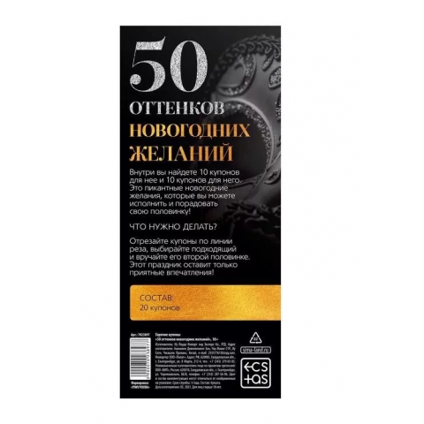 «50 оттенков новогодних желаний» — это не просто набор, а способ подарить друг другу эмоции, которые не купишь ни в одном магазине. Пусть каждый купон станет вашим маленьким секретом, вашим обещанием и вашим праздником двоих.