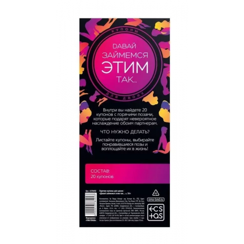 Внутри вас ждут 20 купонов, каждый из которых открывает новую позу или идею для вдохновляющего вечера. На одной стороне — соблазнительная иллюстрация, на другой — детальное описание, чтобы вы могли без стеснения воплотить фантазию в жизнь. Не нужно ничего придумывать — просто вытяните купон, следуйте подсказке и дайте страсти взять верх.