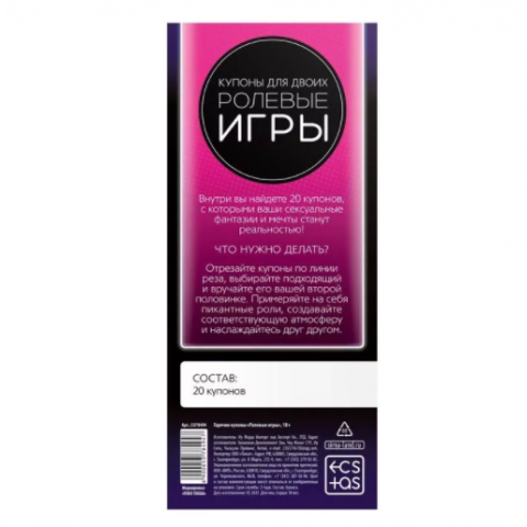 Горячие купоны «Ролевые игры» - идеальный вариант для совместного времяпровождения! Примеряйте на себя разные образы и ситуации, от которых будет приходить возбуждение с каждой выпавшей картой. Не отказывайте себе в удовольствии. Наслаждайтесь друг другом и окунитесь в океан фантазий и страсти.