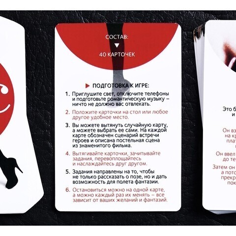 Приглушите свет, отключите телефоны и подготовьте романтическую музыку — ничто не должно вас отвлекать. Вы можете вытянуть случайную карту или выбрать из имеющихся. На каждой карте представлен сценарий встречи героев и описана постельная сцена из знаменитого фильма. Вытягивайте карточки, зачитывайте задания, перевоплощайтесь и наслаждайтесь друг другом. Задания подготовлены так, чтобы вы не только рассказали о позе, но и пофантазировали.