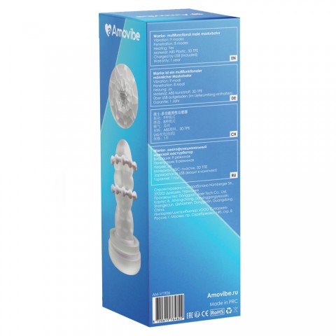 Amovibe Warrior — электронный мастурбатор с сочетанием трёх типов стимуляции: вибрации, поступательных движений (пенетрации) и массажа встроенными бусинами. Жёсткий корпус выполнен из ABS-пластика, внутри размещён съёмный рукав из 3D TPE с мягкой и эластичной текстурой. Функциональность включает 9 режимов вибрации и 8 паттернов пенетрации; ощущения дополнительно формируются рельефными кольцами и узорами внутри канала. Для температурной адаптации предусмотрен двухуровневый подогрев до 42 °C. На лицевой панели расположен экран индикации режимов, а для работы в затемнённом помещении предусмотрена подсветка панели и кнопок. Устройство перезаряжается: полный цикл занимает около 90 минут и обеспечивает до 120 минут автономной работы. Степень водозащиты — IPX6. Габариты корпуса — 16,3 × 8,5 см; длина вставки — 15 см, внутренняя длина канала — 13,5 см; диаметр входа — до 3 см, диапазон диаметра вставки — примерно 5–8 см, диаметр стимулирующих бусин — около 1 см. Для сохранения свойств TPE-рукава рекомендуется использовать только средства на водной основе; подобрать лубрикант можно в разделе лубриканты на водной основе. Комплектация: устройство, съёмный рукав, кабель Type-C, инструкция, фирменная коробка.