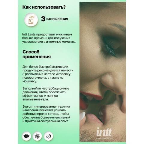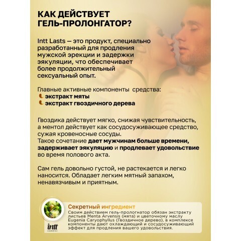 Intt Lasts — это продукт, специально разработанный для продления мужской эрекции и задержки эякуляции, что обеспечивает более продолжительный и приятный сексуальный опыт. Его цель — предоставить мужчинам больше времени для получения удовольствия в интимные моменты. Основными активными ингредиентами геля являются экстракт гвоздики и мяты.