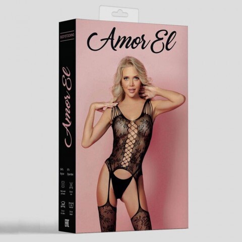 Выполнено изделие в виде боди-комбинезона в черном цвете с имитацией чулок. Шнуровка спереди сделает интригующий акцент на вашей груди, цветочный узор добавит ему нежности, а открытая зона ягодиц будет самым манящим объектом всего этого эротического мероприятия, от чего вашему мужчине захочется скорее к вам прикоснуться.