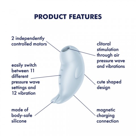 Корпус выполнен из бархатистого на ощупь силикона в голубом цвете и удобно лежит в руке благодаря продуманной развесовке. Перезаряжаемый формат делает устройство практичным в повседневном использовании, а класс влагозащиты IPX7 позволяет применять его в душе или ванне и упрощает гигиену. Нейтральный дизайн и тихая работа помогают сохранить приватность, а компактные размеры удобны для хранения и поездок. Seal You Soon подойдёт как для первой знакомства с бесконтактной стимуляцией, так и в качестве многофункционального девайса в коллекции.