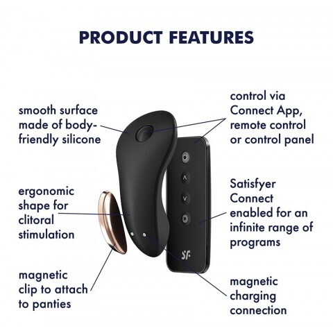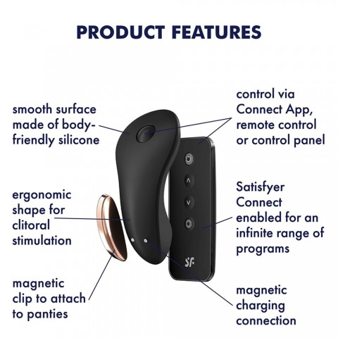 Компактный внешний вибростимулятор для discreet-сценариев дома и вне дома. Корпус облегает контур тела, а магнитная клипса фиксирует аксессуар на нижнем белье. Управление доступно с пульта дистанционного управления и через мобильное приложение Satisfyer Connect: удобно переключать режимы, подбирать интенсивность и сохранять настройки. Модель подходит для одиночных и парных сценариев, когда важны тихая работа и стабильная фиксация.