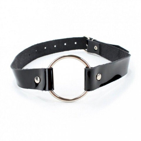 Кляп с кольцом выполнен из чёрной лакированной кожи и предназначен для ролевых сцен и создания определённого образа. Изделие аккуратно фиксируется и помогает добавить разнообразия в интимные игры при соблюдении правил безопасности и взаимного согласия.
