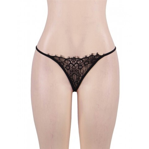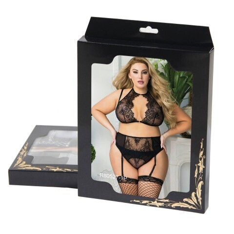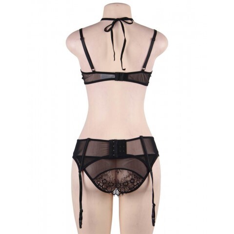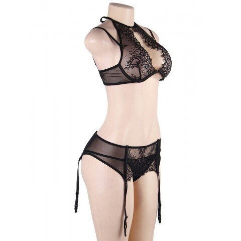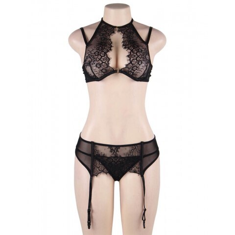 Комплект белья черный: бра, стринги и пояс с ремешками (размер XL-2XL)