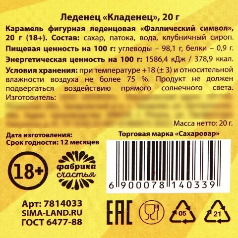 Леденец в форме мужского члена «Кладенец» со вкусом клубники от Фабрики страсти