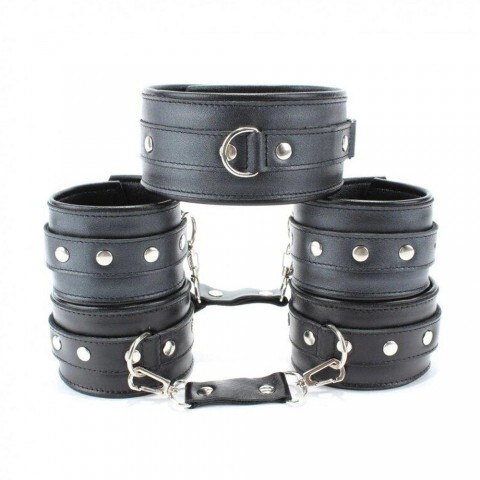 Состоит из наручников, наножников и ошейника черного цвета. Все эти аксессуары способны добавить в грядущую любовную ночь остроты и полноты чувственных ощущений. По желанию вы можете скреплять их кожаными соединениями на карабинах, длина каждого соединения 14 см.