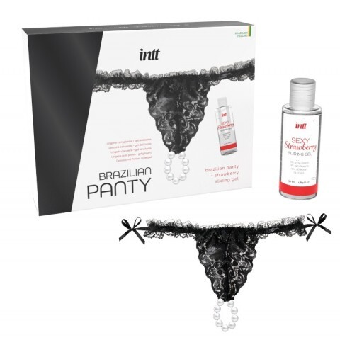 Набор Intt: кружевные трусики черные с бусинками Brazilizan и лубрикант с клубничным ароматом (50 мл.)