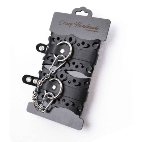Наручники из черной кожи с узорами от Crazy Handmade с авторским дизайном — идеальное сочетание элегантности и утончённости. Резные элементы придают им изысканную атмосферу, подчёркивая красоту тела и создавая эффект нежности. Стальное хромированное кольцо добавляет прочности и стильного акцента. Регулировка осуществляется с помощью прочного кожаного ремешка, что гарантирует удобство и надёжность в использовании. В комплект входит прочная соединительная цепочка с двумя карабинами, обеспечивающая дополнительную безопасность и функциональность.