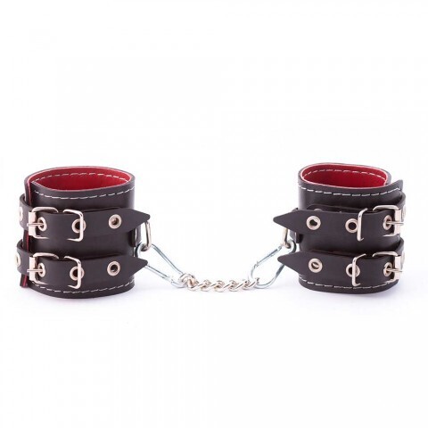 Наручники из кожи с двумя ремнями и красной подкладкой