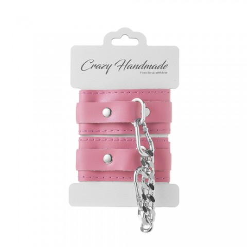 Наручники от Crazyhandmade выполнены из высококачественной натуральной кожи нежного розового оттенка, которая приятно ложится на кожу и дарит мягкость и комфорт при использовании. Надёжная стальная фурнитура с элегантным серебристым покрытием придаёт аксессуару прочность и стильный внешний вид, а включённая соединительная цепочка с двумя карабинами делает наручники универсальными для любых сценариев.