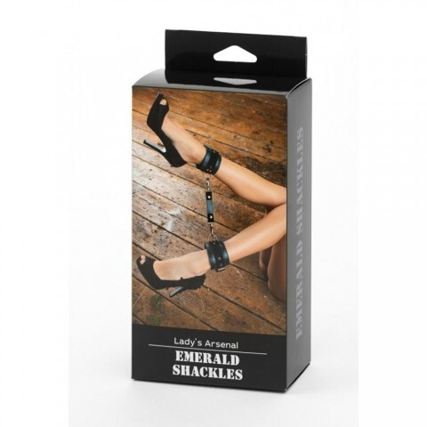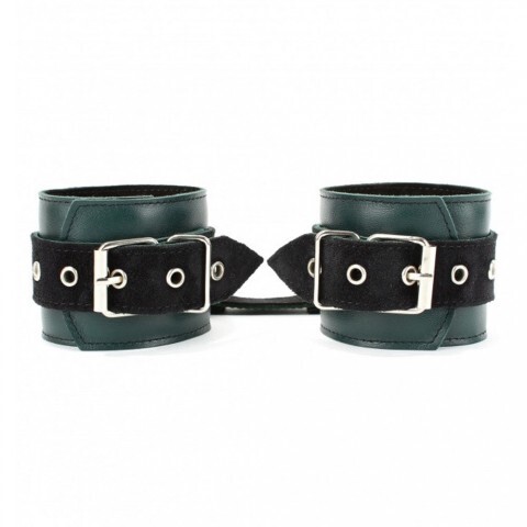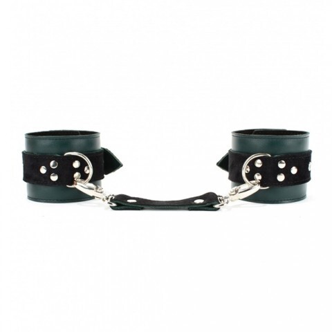 Выполнено изделие из натуральной кожи изумрудного цвета, декорировано черными замшевыми ремнями. Посередине расположено полукольцо из сварной фурнитуры. Надежно фиксируются с помощью пряжек и ремней, позволяющими выбрать нужный размер, а кожаное соединение на карабинах фиксирует оковы вместе. Ослабьте свой предмет страсти и воплотите в жизнь все самые потаенные фантазии для совместного удовольствия.