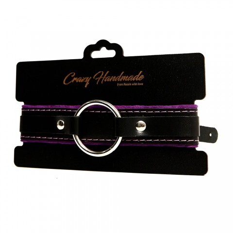 Ошейник от Сrazy Handmade выполнен из прочной черной экокожи и дополнен мягкой фиолетовой подкладкой, которая обеспечивает комфорт даже при длительном ношении. Контрастная прострочка подчеркивает аккуратный и стильный дизайн. Центральное металлическое кольцо служит не только декоративным элементом, но и функциональной деталью для крепления поводка или других аксессуаров. Такой ошейник станет эффектным акцентом в образе и прекрасно подойдет для ролевых игр, создавая атмосферу доверия и притягательности.