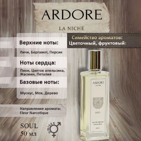 50 мл парфюмерной воды Soul от Ardore, вдохновлённой ароматом Fleur Narcotique. Унисекс-композиция из семейства цветочно-фруктовых окутывает кожу вуалью соблазнительного благоухания и придаёт образу свежий шарм.