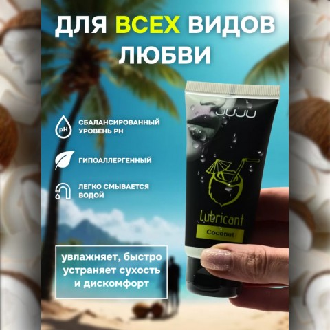 Съедобный лубрикант JUJU на водной основе со вкусом кокоса обеспечивает лёгкое и комфортное скольжение. Формула равномерно распределяется по поверхности и не создаёт ощущения липкости.