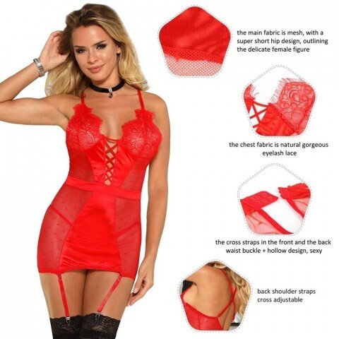 Облегающая полупрозрачная комбинация продемонстрирует ваши роскошные формы, обеспечивая уверенность и комфорт. Подвязки позволяют добавить образу дерзости с помощью сетчатых чулочков, а маленькие стринги акцентирует внимание на ваших аппетитных ягодицах. Это - идеальный выбор для тех, кто хочет разжечь огонь страсти и сделать особенным романтический вечер.