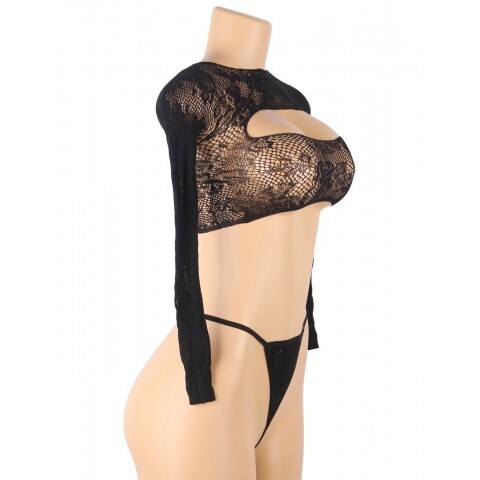 Сексуальный набор: прозрачный топ с длинным рукавом и стринги для смелых и раскованных девушек. Он отлично сидит и подчеркивает достоинства вашей фигуры. Ткань с ажурными кружевами визуально увеличивает грудь, а тонкая ниточка трусиков делает ваш образ вызывающим. Будет горячо и стильно, он оценит ваш стиль и перейдет в наступление. В нашем интернет магазине вы найдете множество нарядов для секса и модных образов для ролевых игр. Будьте собой, создавайте романтику отношений вместе с товарами интернет магазина Extaz.
