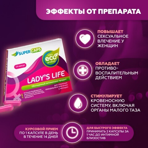 Средство возбуждающее для женщин Lady'sLife от SuperCaps – это современное средство, созданное для усиления сексуального влечения и улучшения общего состояния организма. Упаковка включает 14 капсул с комплексом натуральных активных веществ, разработанных с использованием инновационной технологии гранулирования.