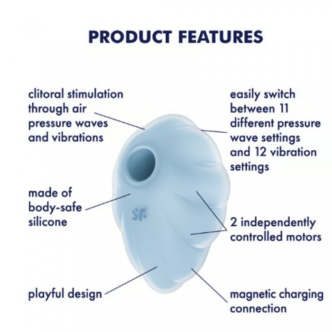 Satisfyer Cloud Dancer — компактный стимулятор для внешней зоны, сочетающий воздушно-волновое воздействие и вибрацию. Два независимых моторчика позволяют гибко настраивать ощущение: 11 уровней воздушной стимуляции и 12 режимов вибрации работают как по отдельности, так и одновременно. Форм-фактор с мягкой насадкой удобно располагается на целевой точке, а эргономичный корпус из бархатистого силикона в голубом цвете комфортно лежит в руке и помогает точно удерживать позицию без лишнего давления.