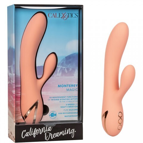 CalExotics California Dreaming Monterey Magic — это элегантный и функциональный вибратор-кролик, который сочетает в себе инновационный дизайн и удобство использования. Этот премиальный вибромассажер из медицинского силикона идеально подходит для вагинальной и клиторальной стимуляции, гарантируя яркие и незабываемые моменты наслаждения.