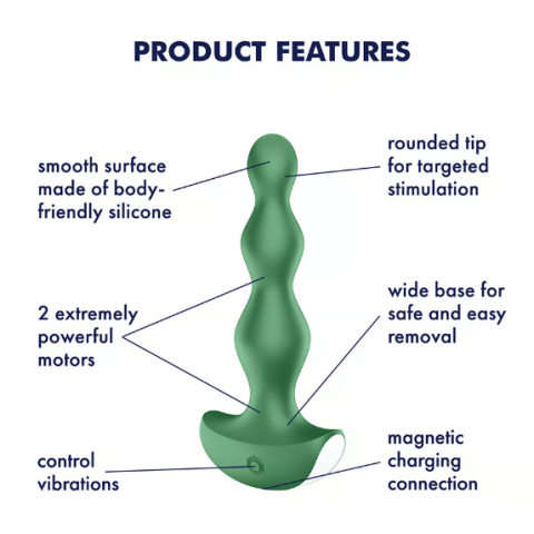Satisfyer Lolli-Plug 2 — компактный виброплаг с поэтапной формой из трёх шариков для деликатного ввода и аккуратной фиксации. Корпус выполнен из мягкого силикона в зелёном цвете; поверхность гладкая и приятная на ощупь. Модель универсальна по сценарию: подходит как начинающим, так и опытным пользователям, а также может использоваться в паре. Основание играет роль ограничителя и удобной ручки, что помогает контролировать глубину и положение изделия. Перезаряжаемый формат и влагозащита расширяют варианты использования и упрощают уход.