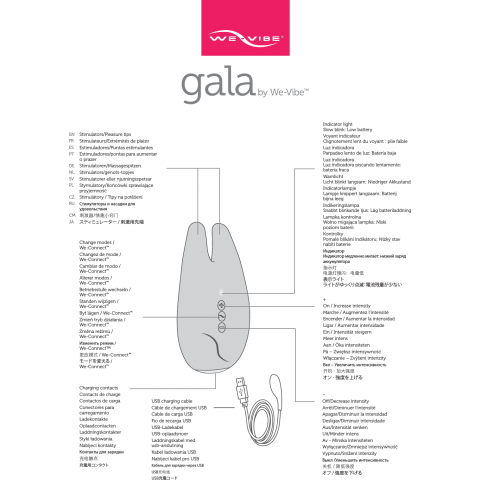 Простое управление тремя кнопками ON/OFF и третья для переключения 10-ти режимов и 10-ти уровней интенсивности. С помощью бесплатного приложения We-Connect вы можете управлять девайсом и делиться контролем Gala из любого места, создавать собственные вибрации и синхронизировать с другими продуктами We-Vibe! Рядышком в коробочке спрятаны чехол и пробник лубриканта вместе с зарядкой! Чертёнок Вам сообщит, когда ему нужно подзарядиться! Световой индикатор на панеле начнет ярко моргать.