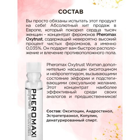 Представляем вам концентрат феромонов для женщин PHEROMAX® woman mit Oxytrust. В этой версии производитель повысил уровень окситоцина, поэтому обольстить мужчину стало еще проще!