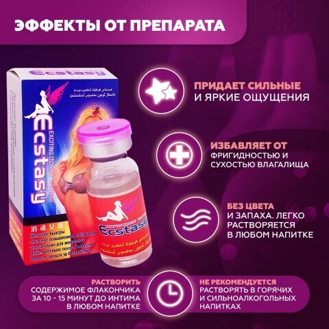 Ecstasy — средство для поддержки женского либидо в удобной жидкой форме. Формула на основе натуральных афродизиаков разработана для деликатной стимуляции, улучшения восприятия близости и повышения отклика на ласки. Препарат предназначен для взрослых женщин и может использоваться эпизодически, когда требуется настроиться на интимную близость, преодолеть утомлённость или скованность и создать комфортные условия для контакта. Жидкая текстура легко смешивается с прохладными напитками, не меняя их цвет и запах, поэтому способ применения остаётся незаметным и простым.